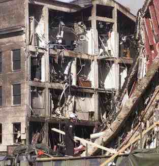 • Very little damage to the 2nd floor prior to section collapse.  Only two windows damaged on the second floor.  This is shown in government photos prior to the collapse of the section.  Collapse of section due to fire and not the impact of the attack aircraft.